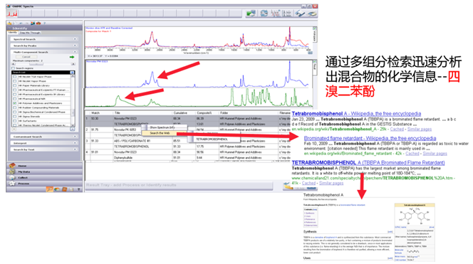 異物分析是專門分析產(chǎn)品上的微小嵌入異物或表面污染物、析出物進(jìn)行之成分的技術(shù)。例如對(duì)表面嵌入異物、斑點(diǎn)、油狀物、噴霜等異常物質(zhì)進(jìn)行定性分析,藉此找尋污染源或配方不相容者,是改善產(chǎn)品最常用的分析方法之一。根據(jù)異物的實(shí)際情況選用合適的紅外光譜圖采樣方法,從而獲得異物高質(zhì)量的紅外光譜圖。可以根據(jù)異物紅外光譜圖官能團(tuán)的吸收峰來確定異物的化學(xué)組成,一般用戶會(huì)自建自己的異物源譜圖庫(kù)。對(duì)于樣品表面的微小污染物,或者在樣品縫隙中的污染物,可以將污染物微量取出后檢測(cè);如果污染物附著在平整的樣品表面,可以將樣品直接放置在顯微紅外的樣品平臺(tái)上進(jìn)行反射或ATR(衰減全反射法)檢測(cè)。測(cè)得污染物光譜后進(jìn)行譜庫(kù)檢索,獲得污染物的成分信息,如下圖所示。