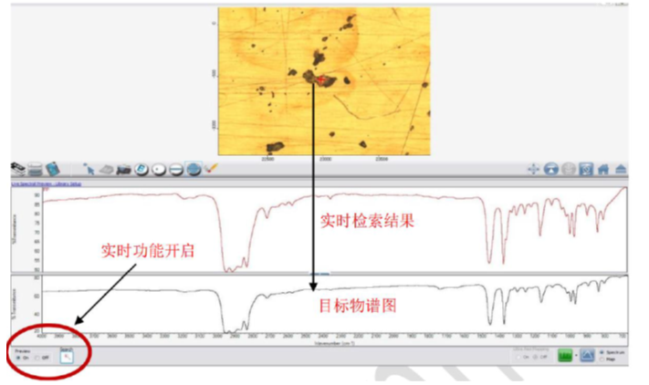 在液體形態(tài)樣品中的異物分析,可通過金膜過濾法將異物過濾出來,然后在顯微紅外下進(jìn)行反射法實(shí)時(shí)掃描,將全部所見異物的成分測(cè)出,如下圖所示。